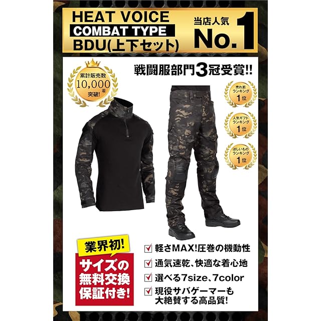 商品名:【HEAT VOICE】サバゲー 服 迷彩服 上下セット 装備 bdu 戦闘服 コンバットパンツ シャツ メンズ レディース ウェア 日本人サイズ エルボーパッド ニーパッド付き (S, マルチカムブラック)