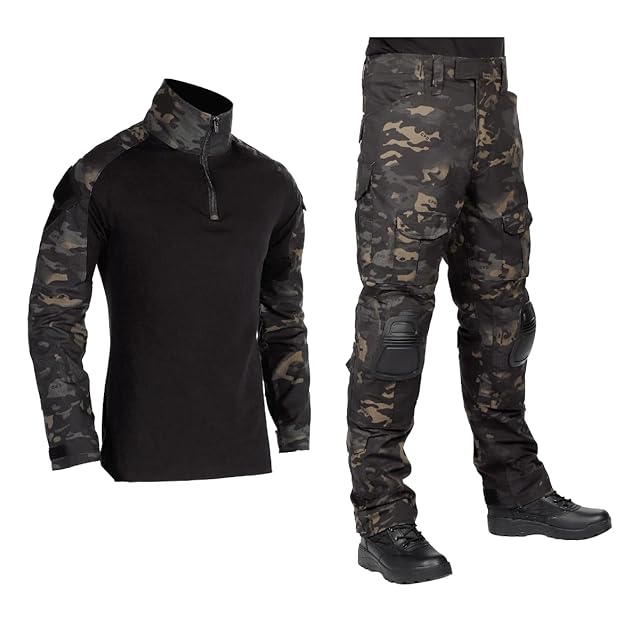 【HEAT VOICE】サバゲー 服 迷彩服 上下セット 装備 bdu 戦闘服 コンバットパンツ シャツ メンズ レディース ウェア 日本人サイズ エルボーパッド ニーパッド付き (S, マルチカムブラック)