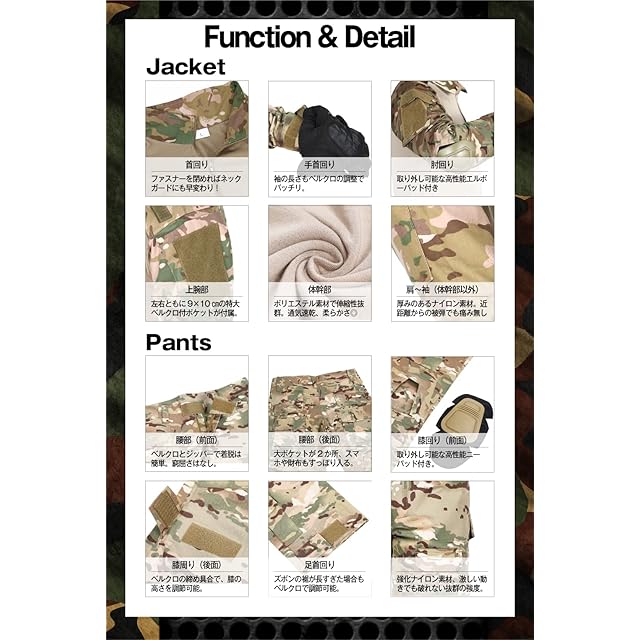 コンバットシャツタイプの迷彩服(上下セット)です。素材はナイロン+ポリエステルになります。ポリエステルの部分は伸縮性・吸汗性抜群です。簡単に取り外しができるエルボーパッド・ニーパッド付です。通気性も良く、季節は春、夏、秋、冬とオールシーズン使用可能です。