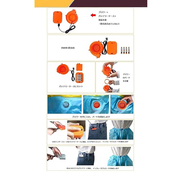 電働空気ロールプレイ:本品は電働ファンで持続的に空気を膨らませます。バッテリーケース内ポケット内蔵です。空気で膨らむ新タイプの簡易コスプレ衣装です!5番電池4本が別途必要です。