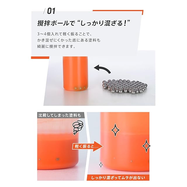 【ふたを回して簡単に開閉が可能で塗料の出方を調整できます!】塗料の使用量に応じて調整してください。 塗料を使用でよくある塗料が混ざらない悩み、撹拌ボールで解決します!ドロッパーボトルを軽く振るだけで塗料を簡単に混ぜることができます!