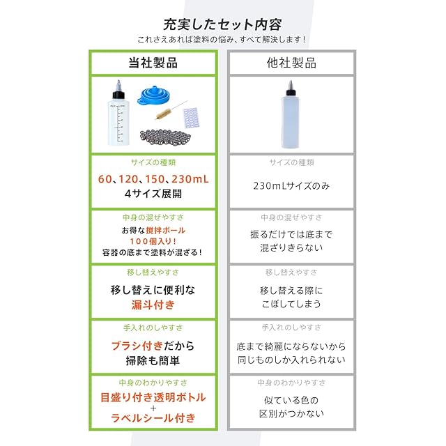 ウィバースの撹拌ボールつきドロッパーボトル!撹拌ボールつきで塗料を簡単に混ぜることができ、すぐに使用することができます! エアブラシへの移し替え、直接塗る、塗料を整理する、様々な用途に活躍します! ボトル本体の使い勝手、改良しました!塗料の蒸発を防ぐ密閉式の構造を採用し、塗料ボトルとしての役割を強化しました。ふたを回して簡単に開閉が可能で塗料の出方を調整できます!塗料の使用量に応じて調整してください。 塗料を使用でよくある塗料が混ざらない悩み、撹拌ボールで解決します!ドロッパーボトルを軽く振るだけで塗料を簡単に混ぜることができます! お客様の声をもとにドロッパーボトルの使用に必要な付属品をおつけしました!塗料の移し替えに便利な漏斗、塗料ボトルの洗浄に便利なブラシ、ボトルの識別に便利なラベルシールの3つを付属品としておつけしました。 ドロッパーボトルは120mL、150mL、230mLの3サイズから選択可能で用途に合わせてお選びいただけます。 【商品仕様】ドロッパーボトル本体、撹拌ボール100個、漏斗、ボトル、ラベルシール