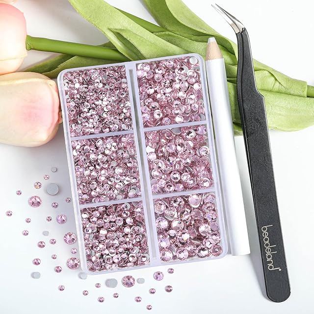 Beadsland(ビーズランド)4,300個 フラットバック ラインストーンライトピンク のラインストーン ネイル用ジェム ラウンド クリスタルラインストーン 手工芸用 6サイズ混合 ピンセットとワックスペンシルキット付き、SS6-SS20、ライトローズ