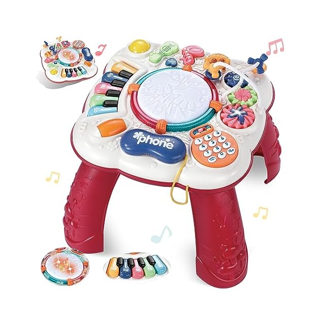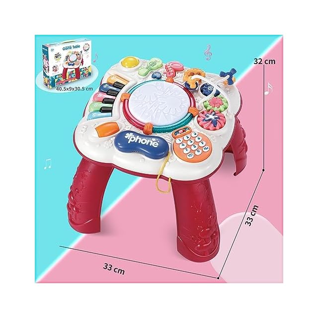 【商品仕樣】多機能楽器玩具(ミュージカルテーブル、赤)x 1 、サイズ(組み立てた後。):32×32×32cm。数多のバリエーションで音や音楽が鳴って楽しい玩具だ。