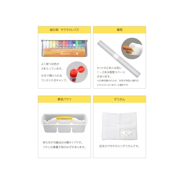 【セット内容】 ・画材バッグ ・ショルダーベルト付 ・筆洗 ・パレット ・太筆(15号) ・細筆(6号) ・筆ケース ・雑巾 ・サクラマット水彩12色13本 ・水彩絵具の使い方の手引き 【ケースサイズ】約縦13cm×横33cm×奥行13cm