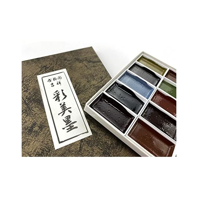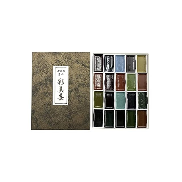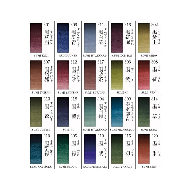 セット内容:302 墨黄土・308 墨紅・314 墨草・320 墨朱・316 墨紅梅・303 墨黄・309 墨水群青・3015 墨柳・311 墨白群・317 墨栗茶・304 墨白緑・310 墨紫・306 墨群青・312 墨辰砂・318 墨藍・305 墨緑・301 墨燕脂・307 墨岱赭・313 墨鶯・319 墨群緑