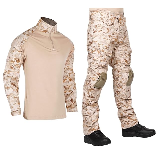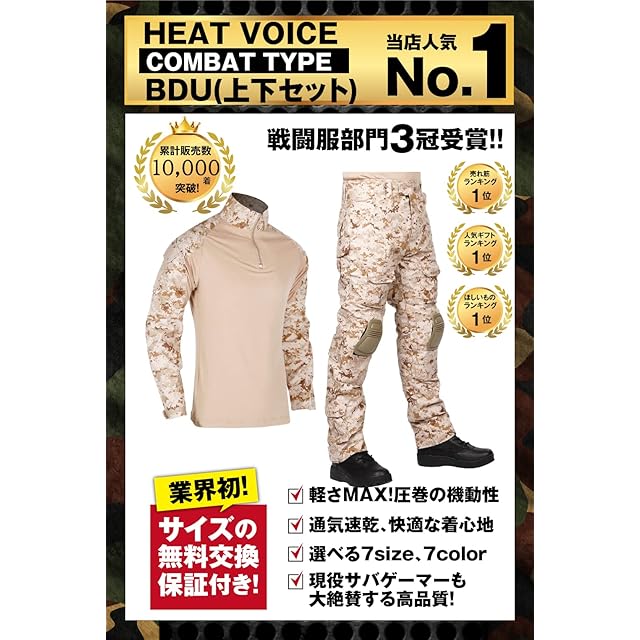商品名:【HEAT VOICE】サバゲー 服 迷彩服 上下セット 装備 bdu 戦闘服 コンバットパンツ シャツ メンズ レディース ウェア 日本人サイズ エルボーパッド ニーパッド付き(XL, ピクセルデザート)