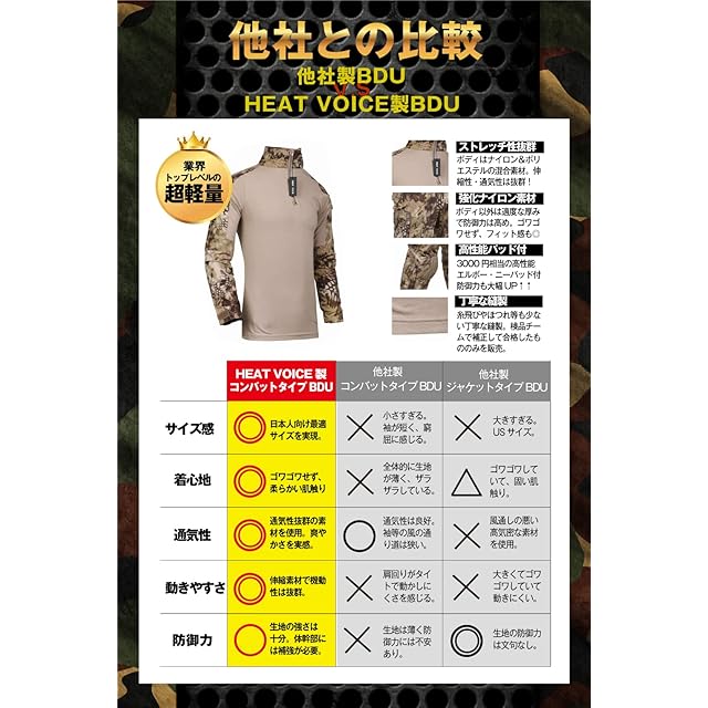 コンバットシャツタイプの迷彩服(上下セット)です。素材はナイロン+ポリエステルになります。ポリエステルの部分は伸縮性・吸汗性抜群です。簡単に取り外しができるエルボーパッド・ニーパッド付です。通気性も良く、季節は春、夏、秋、冬とオールシーズン使用可能です。