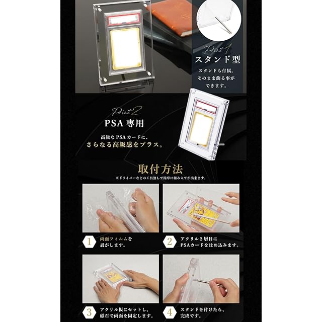 ✅【あなたの大切なPSAカードに高級感を】高透明度のクリアアクリルを使用。厚さ18mmで前面にダイヤモンドカット可能を施すことで重厚感と高級感を演出しました。見る角度でキラッと光り光沢感を持たせます。この厚みとダイヤモンドカットがカードの魅力を引き上げてくれます。✅【両面UVカット率 99.8%】アクリル本体にUVカット機能 を搭載。日焼けによる変色、劣化、色褪せを防ぎ、大切なカードを 紫外線 によるダメージから守ります。蛍光灯の光でもカードが 色落ち することなくディスプレイ可能です。第三者機関にて試験済み✅【工具不要のマグネット式】マグネット式のため、取り外しがしやすく、カードの交換や保管をスムーズに行うことができます。スタンドのみネジ式となっています。 スタンドとネジは一体となっており、工具不要で取り付けが可能です。✅【PSA鑑定品に対応】高級なPSA・CGC鑑定品をしっかりと保護する事ができます。 【スタンドも付属】スタンドも付属。そのまま飾る事ができます。第三者機関での検証につきまして_試験名 : 紫外線遮蔽性試験 証明書番号:DTTR23070702 出典:desirtech合同会社 日付:2023/7/7