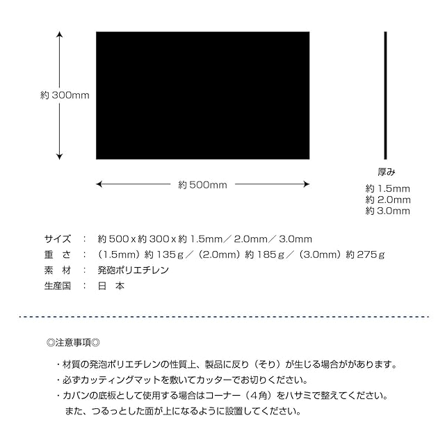 商品:カバン用底板<br>サイズ:約500x300mm<br>厚み:約1.5mm、2.0mm、3.0mmの3種<br>重さ:1.5mm/約135g、2.0mm/約185g、3.0mm/約275g<br>素材:発砲ポリエチレン<br>生産国:日本<br><br>特徴:柔らかいバッグを安定させる底板、お持ちのバッグに合わせてカッターで切っていただけます。<br> 一般的なビジネスバッグ用には2.0mmがオススメです。<br><br>・お客様のお使いのモニターにより、実物と画像の色に若干の違いが出る場合がございます。