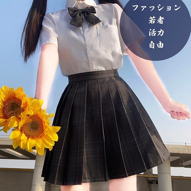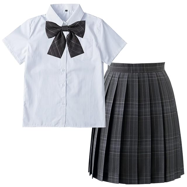 [SYRHSYB] 制服 スカート ミニ プリーツスカート コスプレ 写真撮影 パーティー衣装 JKスカート 白いシャツ リボン スクールスカート3点セット(炭素灰セット/半袖, 2XL)