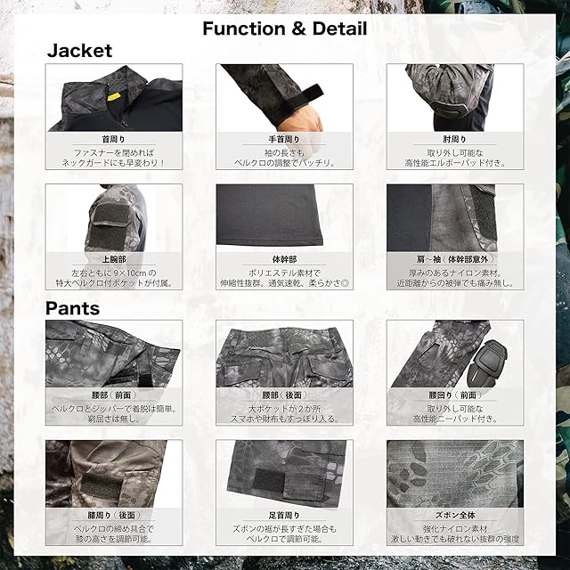 【セット内容】コンバットシャツタイプの迷彩服上下セット。取り外しができるエルボーパッド・ニーパッド各2個も付属。通気性も良く、季節は春、夏、秋、冬とオールシーズン使用可能です。