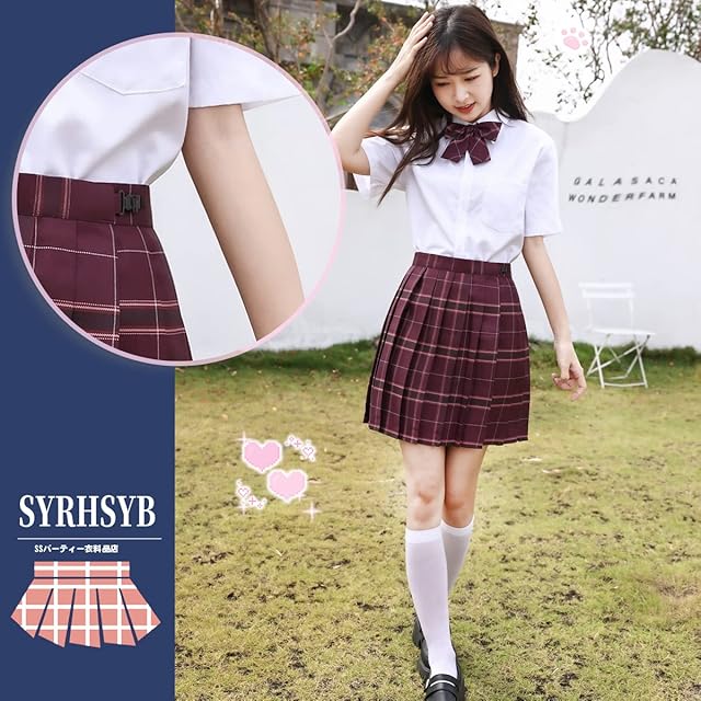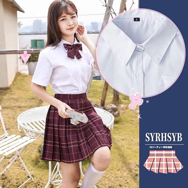 商品名:[SYRHSYB] 制服 スカート ミニ プリーツスカート コスプレ 写真撮影 パーティー衣装 JKスカート 白いシャツ リボン スクールスカート3点セット(沙華セット/半袖, S)