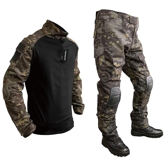 [Howasuto] ホワスト サバゲ― 迷彩服 上下セットエルボーパッド ニーパッド付き 戦闘服 長袖 服 軍服 コンバットシャツ (XL, マルチカムブラック)