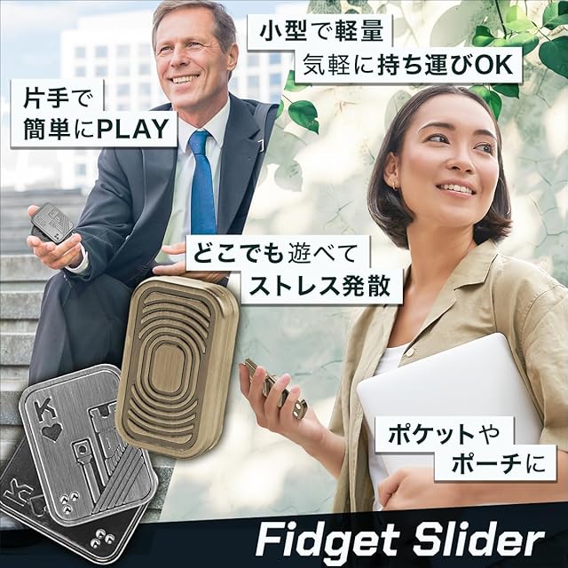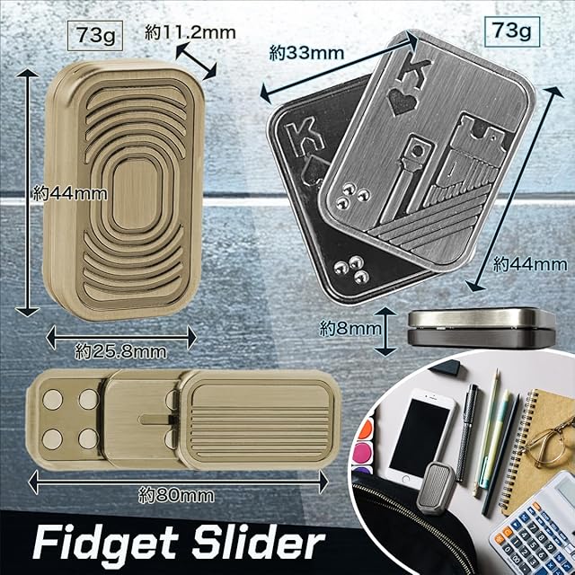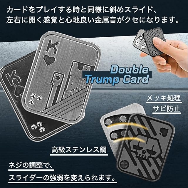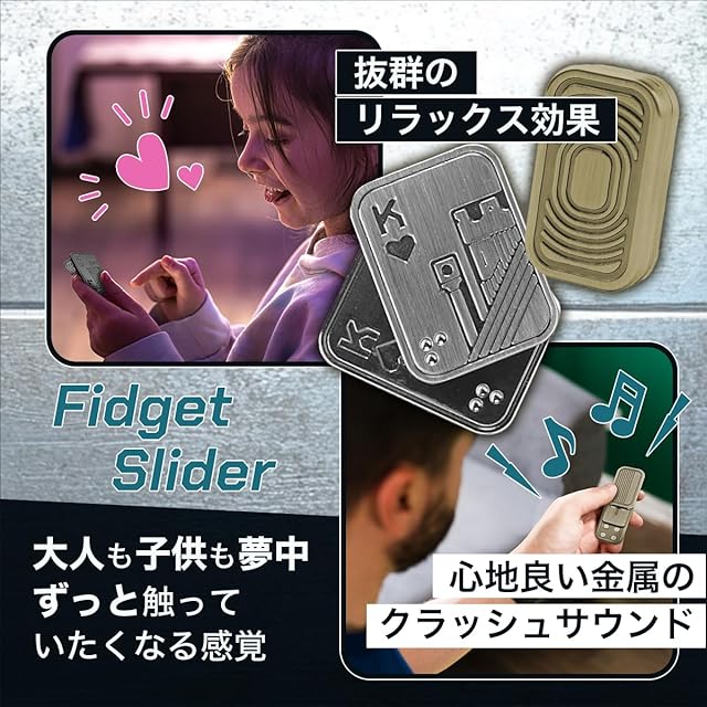 <br><br>高品質なメタルフィジェットスライダーでストレス解消 このメタルフィジェットスライダーは、精密に機械加工された高品質なステンレス素材で作られており、耐久性に優れています。指先で簡単に操作でき、鮮明な金属音と磁力によるフィードバックで、ストレス解消や集中力の向上に最適です。片手で簡単にプレイできるので大人向けのフィジェットトイとして、仕事や学業でのリラックスアイテムに最適な選択です。<br><br>悪い習慣をやめるサポートアイテムとしても効果的 爪噛みや喫煙など、悪い習慣を断ち切る手助けをしてくれるフィジェットスライダーです。手持ち無沙汰な時にこのスライダーを使うことで、無意識の習慣を置き換えることができるので、集中力UPや思考の刺激になります。心地良い金属のクラッシュ音と触覚フィードバックが楽しめ、集中力を高めるだけでなく、リラックス効果も期待できます。<br><br>精巧でユニークな磁気デザインと心地よい操作感を実現 トリプルプッシュカードは、3層の金属シートと潤滑パッド、内部に搭載された強力な磁気により、上下のスムーズな操作感と心地よい金属音を生み出します。また、ダブルトランプカードはカードをプレイする様に斜めスライドすることで、左右に開く感覚と心地良い金属音がクセになります。ネジの調整によりスライダーの強弱を変えることも可能です。<br><br>多用途で贈り物にも最適なフィジェットおもちゃ デザイン性と実用性を兼ね備えたフィジェットトイは、ギフトとしても大変喜ばれるアイテムです。お子様の手遊びアイテムとしてだけでなく、父親、友人、兄弟、パートナーへの誕生日やクリスマス、新年の贈り物に最適です。ストレス解消アイテムとして、年齢や性別を問わず、誰にでも喜ばれるプレゼントです。<br><br>ポータブルデザインでどこでも気軽に使用可能 コンパクトで73gと軽量なデザインにより、フィジェットスライダーは持ち運びが簡単です。ポケットにすっぽり入るサイズで、ハンドバッグやバッグパックに入れておけば、オフィス、学校、旅行先、公共の場所など、いつでもどこでも気軽に楽しめます。 【セット内容】フィジェットスライダー2種セット【サイズ】約44㎜x33㎜x8㎜、約44㎜x25.8㎜x11.2㎜※対象年齢6歳以上<br><br>