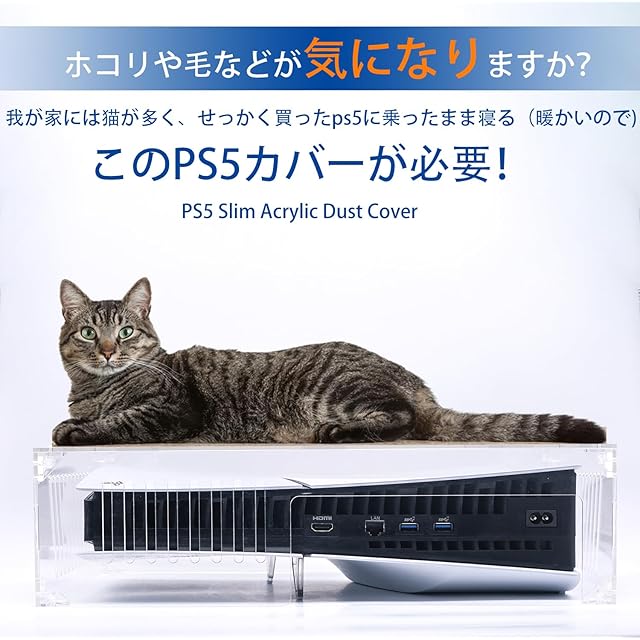 【サイズがピッタリ】アクリルカバー自体大きさには余裕ある為使い勝手は良いです。ディスク用のスリットやUSB端子用の穴もあるので、いちいち外さなくてもよいです。ps5スタンド使用していても特に問題なく使用できます!