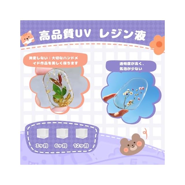 気泡少なく、使いやすい:このUVレジン液は気泡がほとんど発生せず、滑らかな仕上がりが実現できます。適度な粘度により、型に流し込みやすく、作業がスムーズに進みます。ご使用中にご不明な点がございましたら、いつでもお気軽にお問い合わせください。ご購入後も安心してお使いいただけるよう、お客様のご満足を第一に、丁寧なサポートを心がけております。