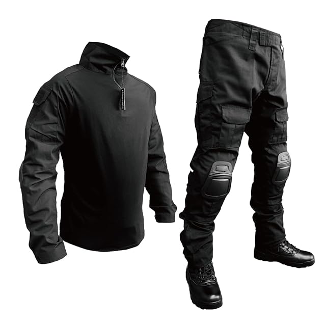 [Howasuto] ホワスト サバゲ― 迷彩服 上下セットエルボーパッド ニーパッド付き 戦闘服 長袖 服 軍服 コンバットシャツ (M, ブラック)