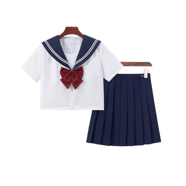 [COSSA] セーラー服 本格制服 コスプレ 半袖 JK 女子高生 制服 中学生 高校生 スカート 蝶結び 3点セット スクールスカート コスチューム 大きいサイズ (レッドブルー, XXXL)