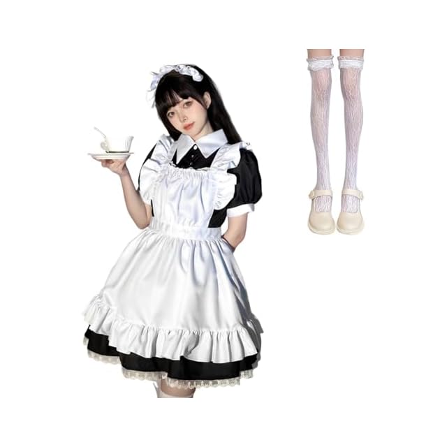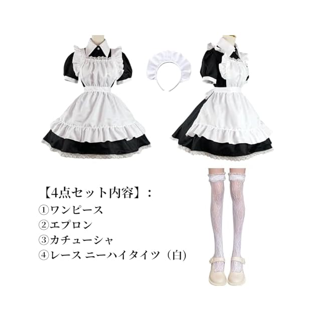 【豪華4点セット内容】:ワンピース+エプロン+カチューシャ+レース ニーハイタイツ(白)
