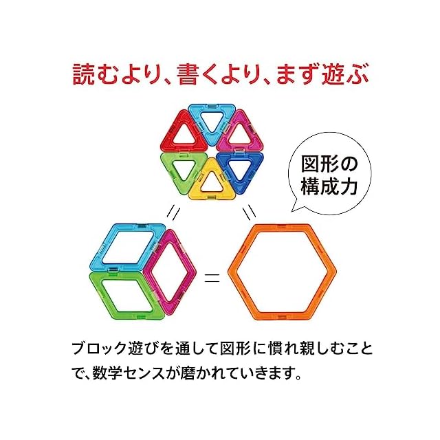 【世界63ヶ国で人気沸騰中! 磁石でつながる数学ブロック】くっつけてはなして、自分のセンスを生かしながら、様々な形や世界観をつくれる磁石内蔵のマグネットブロック! 様々な形を組み合わせて、オリジナル作品も作れるおもちゃです。