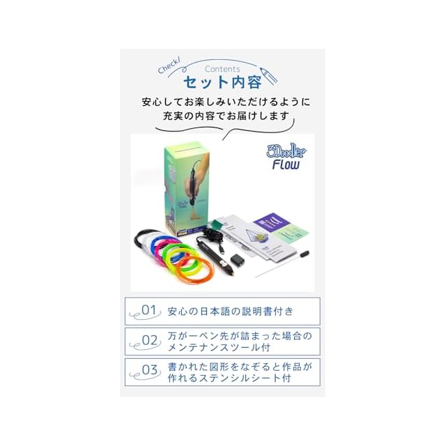 3Doodler FLOW 3Dペンになります。 ✅【ご購入前に必ずご確認下さい】 先端が非常に熱くなりますので使用中に先端を触らないでください。特にお子様がご使用する際は十分に気を付けて下さい。 ✅【パッケージ内容】1:本体(ペン) 2:8カラーのPLAフィラメント(1カラー/約3m、細さ/1.75mm)※カラーは写真と異なる場合があります 3:電源アダプター 4:ツール 5:日本語説明書をダウンロードできるQRコード 6:ガイドブック(日本語版) ※商品の仕様は通知なしで、変更や改善されることがあります。(変更や改善によって写真のものと異なる仕様の場合があります)