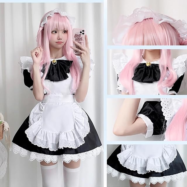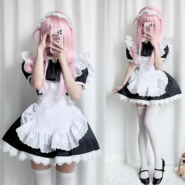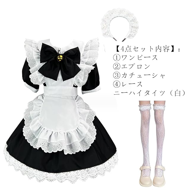 [AOTYP] コスプレ メイド 5点セット ワンピース ショート丈 レディース ニーハイ ソックス 靴下 エプロン カチューシャ 蝶結ぶ コスチューム 仮装 コンカフェ メイドカフェ ハロウィン クリスマス ブラック2XL