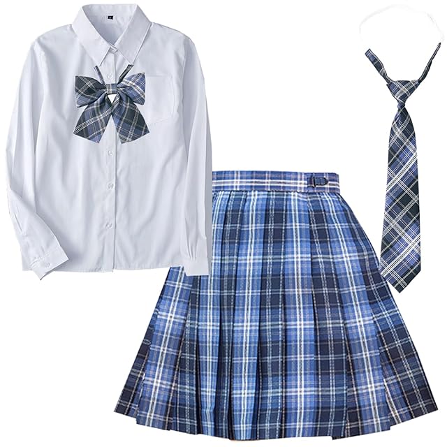[SYRHSYB] 制服セット スカート 丈48cm jk コスプレ 4点セット シャツ ネクタイ リボン 女子高生制服 パーティー衣装 遊園地 文化祭 (滝島の海-長袖,M)