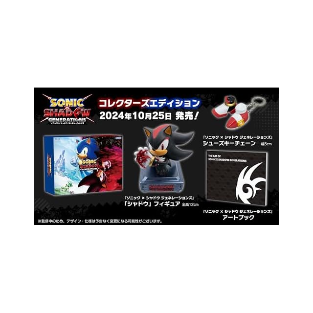 限定版同梱物: ・『ソニック × シャドウ ジェネレーションズ』(パッケージ版) ・『ソニック × シャドウ ジェネレーションズ』 「シャドウ」フィギュア ・『ソニック × シャドウ ジェネレーションズ』 シューズキーチェーン ・『ソニック × シャドウ ジェネレーションズ』 アートブック