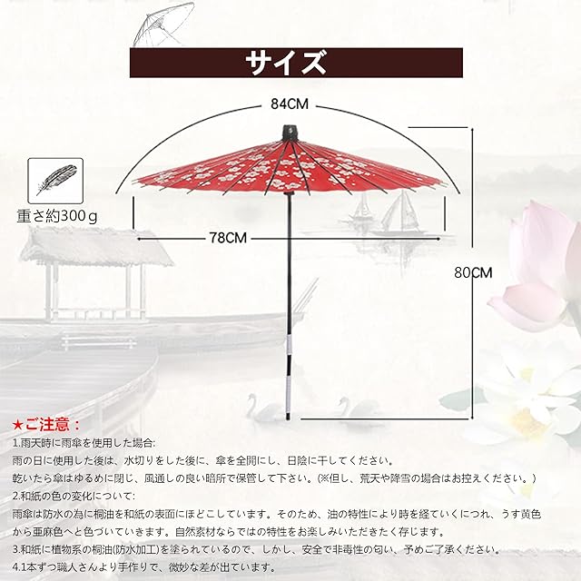 ★ご注意点: 1.雨天時に雨傘を使用した場合: 雨の日に使用した後は、水切りをした後に、傘を全開にし、日陰に干してください。乾いたら傘はゆるめに閉じ、風通しの良い暗所で保管して下さい。(※但し、荒天や降雪の場合はお控えください。) 2.和紙の色の変化について: 雨傘は防水の為に桐油を和紙の表面にほどこしています。そのため、油の特性により時を経ていくにつれ、うす黄色から亜麻色へと色づいていきます。自然素材ならではの特性をお楽しみいただきたく存じます。 3.和紙に植物系の桐油(防水加工)を塗られているので、しかし、安全で非毒性の匂い、予めご了承ください。 4.1本ずつ職人さんより手作りで、微妙な差が出ています。