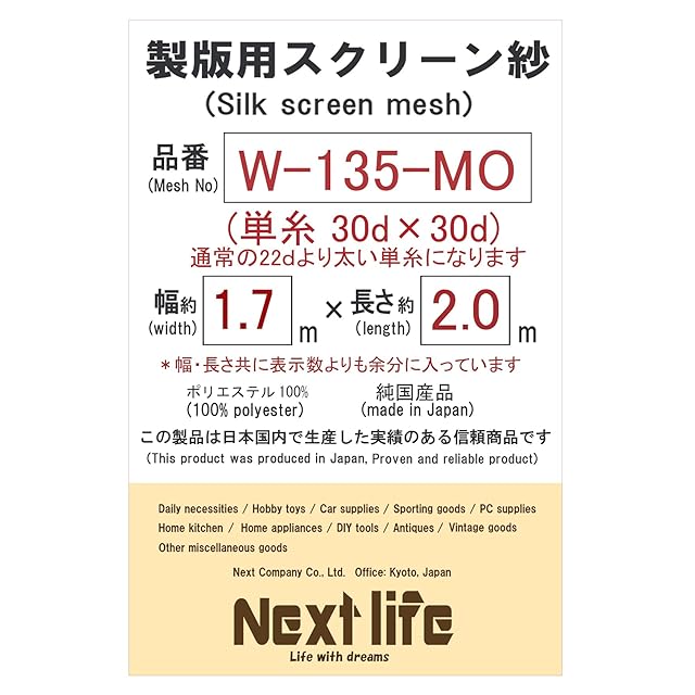 商品名:【nextlife】W-135-MO(単糸30d) 製版用スクリーン紗 (シルクスクリーンメッシュ) 国産品・テトロン100%・スクリーン印刷 幅1.7m×長さ2.0m (白)・(24~315メッシュ各種有)