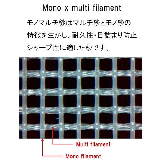 MU(マルチ紗):細い糸を束ねて1本の糸にしています。強度に優れて、目寄れが防げます