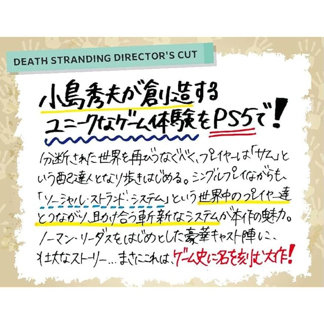 「デス・ストランディング」は世界を変えた。人類は分断され、孤立した。サム・ポーター・ブリッジズは、未来への希望を手に、世界を再び繋ぐために歩きはじめる。 全世界待望。小島秀夫が創造する未だかつてないゲーム体験が、新要素を加えたDIRECTOR'S CUTとしてPS5用にリマスター化。 主人公サム・ポーター・ブリッジズを演じるノーマン・リーダスをはじめ、マッツ・ミケルセン、レア・セドゥ、リンゼイ・ワグナーら世界的名優たちが出演する。
