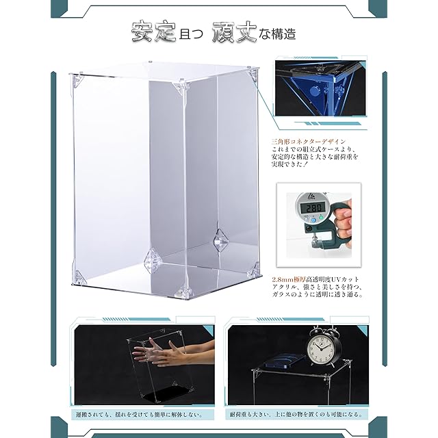 【UVから守る】フィギュアの日焼けによる劣化を防ぐUVカット加工を施している。UVカット率99.3%以上(※ISO9050準拠)、紫外線からのダメージをしっかりガードできる!● 壊れにくい、厳選した厚さ2.8mmの高透明アクリル素材を使用、貴重なコレクションを確実に保護します。