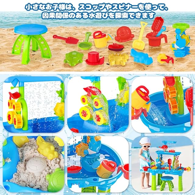 【砂盤のおもちゃのアクセサリーが豊富】水遊びのテーブルが子供たちの夢の王国を作ります。水上玩具セットには、イルカ漏斗、水風車、船、じょうろ、スコップ、スプーン、熊手、ふるい、小桶、カニ、砂型、小さな椅子など、やかん、たくさんのアクセサリーがついています。子供たちが親の助けを借りて一緒に探索して構築することができ、組み立てが簡単になります。注意:セットには黄色いバケツは含まれていません。