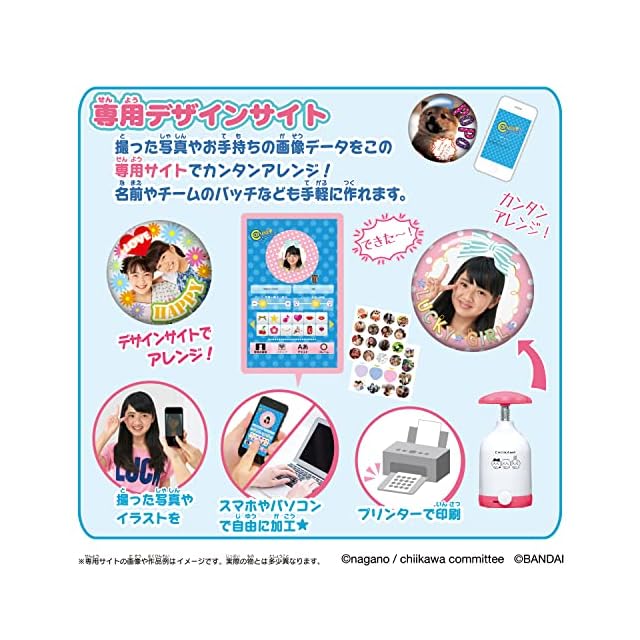 素材をセットしてハンドルを回すだけで、約1分ほどで簡単に「ちいかわ」のかわいい&シュールな缶バッチが作れます。本体はこのセットオリジナルの「ちいかわ」のデザイン。