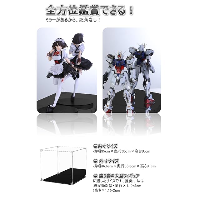 【サイズを決める】● 内寸サイズ:横幅35cm×奥行35cm×高さ30cm ● 外寸サイズ:横幅36.6cm×奥行36.3cm×高さ31cm● 展示ケースの推奨寸法は飾る物の(幅・奥行×1.1)+5cm、(高さ×1.1)+2cm ● 座り姿の大型フィギュア、超合金モデル、複数のガンプラ、或いは同じくらいの高さと幅のある展示品に適したサイズです
