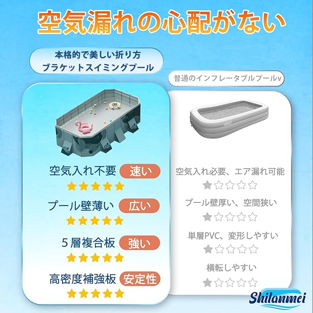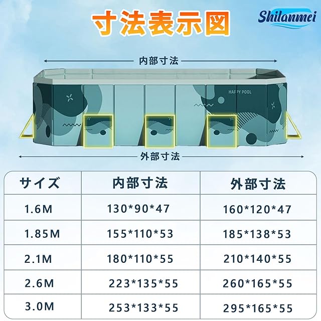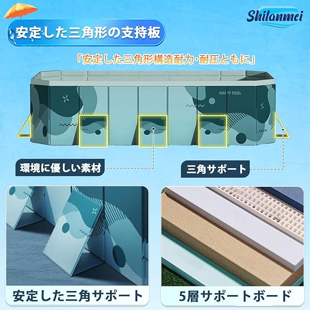 【使いやすさが魅力のプール】:「Shilanmei折りたたみプール」、組み立て不要、めんどな空気入れする必要がなく、穴が開いて萎んでしまう心配もございません!わざわざ高価な電動エアーポンプを購入する必要もない!屋外でも室内でも使える、暑い季節に大活躍!普段使わないときは、折りたたんでコンパクトに収納!<br><br> 【型崩れしないタイプ】:夏の水遊びを思いっきり遊べる頑丈設計!プールは、複合補強板とPVCで構成されている。PVC複合補強板の生地は最先端の技術で耐摩耗性と防水性が高いため、周囲には複数の三角形の支持板が分布しており、プールの外広がり変形を防止している。サポート力が 98% 向上しています、従来品より壁を支える部分を厚くしたことで安定感抜群、プールの型崩れの心配もありません。<br><br> 【滑り止め、ペットと子供に安全】:Shilanmei 折りたたみ式プールは、内壁と底の両方に厚い滑り止め素材を備えており、水を楽しんでいるときに滑りや落下を防ぎます。 子供用プールの側面では、子供やペットが簡単に飛び越えて水遊びを安全に行うことができます。<br><br> 【便利な水抜き栓付き】プールの底と側面に排水口付きだから、短時間に排水可能です。面倒な片付けも簡単にできます!水がプールいっぱいに入っていると意外と重く、ひっくり返して排水させるのはとても重労働となる場合がありますので、水抜き栓があるタイプのをオススメ。ご注意:安全のため、水量は最大容量の80%を超えないように注意してください。<br><br> 【家でも楽しく遊べるハッピープール 】家でも楽しく遊びを!夏の暑い時期に家でも楽しく遊べる大型ハッピープールを開発しました。ご自宅や公園などでファミリープールを使って楽しく遊んでください。 ボールプール、子供用 プール、ペットプール、家庭用 プール、子供のおもちゃ箱として大活躍します。屋外プール、バスタブ、おもちゃの箱、1台3役で1年中使える!お子様の水遊び、大きな物を洗う、ペットバス、おもちゃ入れ、まだまだ多くの用途があります。屋内プール、お庭、ビーチ、屋外などいつでもどこでも簡単に使える。暑い季節に大活躍!<br><br>