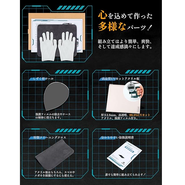 【安心できる】 ● デザイン特許を取得した三角形コネクター固定構造設計は、はめ込み式展示ケースよりも安定しており、運搬されても、揺れを受けても簡単に解体しない ● 耐荷重も大きい、上にさまざまなアイテムが置けます ● アクリル板に角丸加工を施します、手に優しい ● オリジナルの組み立て工具、特製クリーニングクロスや手袋が付属しており、簡単に組み立てや分解ができます。
