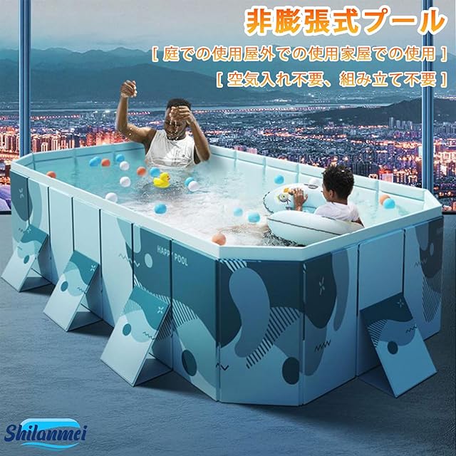 【使いやすさが魅力のプール】:「Shilanmei折りたたみプール」、組み立て不要、めんどな空気入れする必要がなく、穴が開いて萎んでしまう心配もございません!わざわざ高価な電動エアーポンプを購入する必要もない!屋外でも室内でも使える、暑い季節に大活躍!普段使わないときは、折りたたんでコンパクトに収納!<br><br> 【型崩れしないタイプ】:夏の水遊びを思いっきり遊べる頑丈設計!プールは、複合補強板とPVCで構成されている。PVC複合補強板の生地は最先端の技術で耐摩耗性と防水性が高いため、周囲には複数の三角形の支持板が分布しており、プールの外広がり変形を防止している。サポート力が 98% 向上しています、従来品より壁を支える部分を厚くしたことで安定感抜群、プールの型崩れの心配もありません。<br><br> 【滑り止め、ペットと子供に安全】:Shilanmei 折りたたみ式プールは、内壁と底の両方に厚い滑り止め素材を備えており、水を楽しんでいるときに滑りや落下を防ぎます。 子供用プールの側面では、子供やペットが簡単に飛び越えて水遊びを安全に行うことができます。<br><br> 【便利な水抜き栓付き】プールの底と側面に排水口付きだから、短時間に排水可能です。面倒な片付けも簡単にできます!水がプールいっぱいに入っていると意外と重く、ひっくり返して排水させるのはとても重労働となる場合がありますので、水抜き栓があるタイプのをオススメ。ご注意:安全のため、水量は最大容量の80%を超えないように注意してください。<br><br> 【家でも楽しく遊べるハッピープール 】家でも楽しく遊びを!夏の暑い時期に家でも楽しく遊べる大型ハッピープールを開発しました。ご自宅や公園などでファミリープールを使って楽しく遊んでください。 ボールプール、子供用 プール、ペットプール、家庭用 プール、子供のおもちゃ箱として大活躍します。屋外プール、バスタブ、おもちゃの箱、1台3役で1年中使える!お子様の水遊び、大きな物を洗う、ペットバス、おもちゃ入れ、まだまだ多くの用途があります。屋内プール、お庭、ビーチ、屋外などいつでもどこでも簡単に使える。暑い季節に大活躍!<br><br>