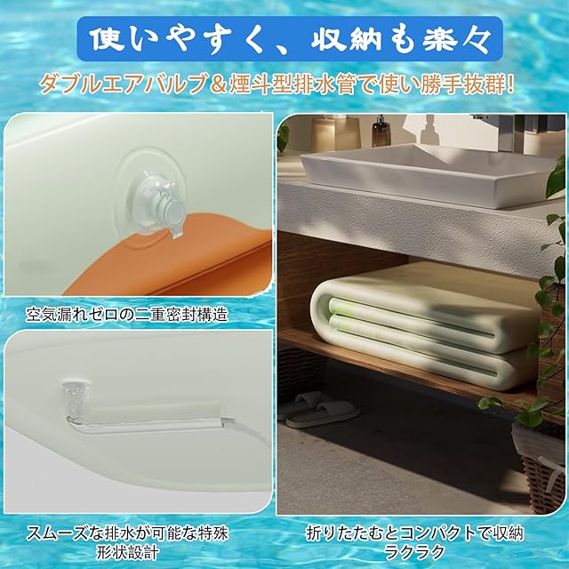 【ママに嬉しい簡単設置・収納】「収納楽なプール」の要望にお応え!ダブルエアバルブで空気漏れ知らず、煙斗型排水管で水抜きもスムーズ。折りたたむとコンパクトサイズになり、マンションやアパートの限られた収納スペースにもすっきり収まります。