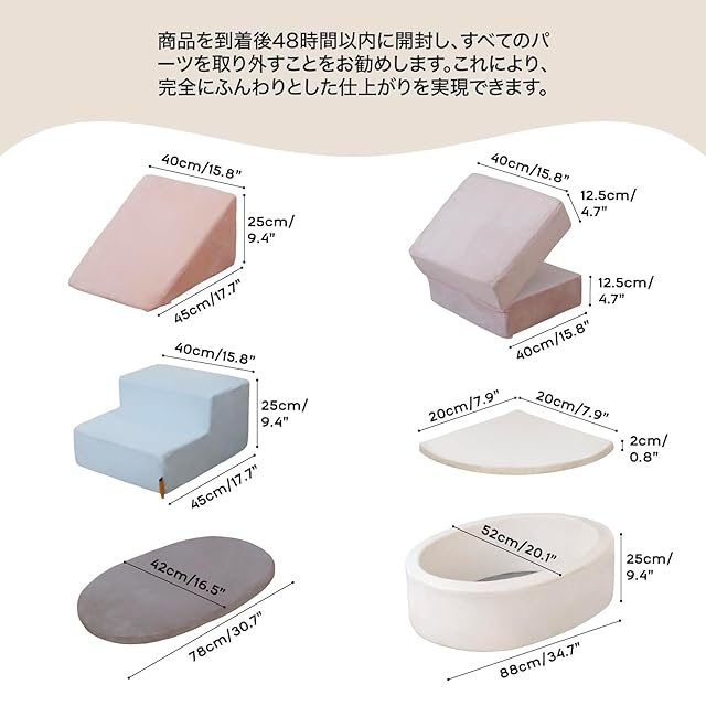 【柔らかな素材】ブロック内部には高密度のフォームが使われており、優れたサポート力を提供します。外側は肌に優しい柔らかい生地で覆われており、弾力性、安定性、軽さを兼ね備えています。これにより、子どもたちの運動スキルやバランス感覚の発達を助けます。