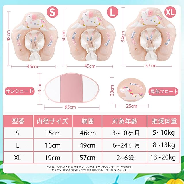 【3サイズ選べる成長対応】S(3-10ヶ月/5-10kg)・L(6-24ヶ月/8-13kg)・XL(2-6歳/13-20kg)。空気量調節機能で、成長段階に合わせた最適なフィット感を実現!XLサイズは広めの19cm内径で太ももも楽々。サイズ選びに迷ったら、お気軽にご相談ください。