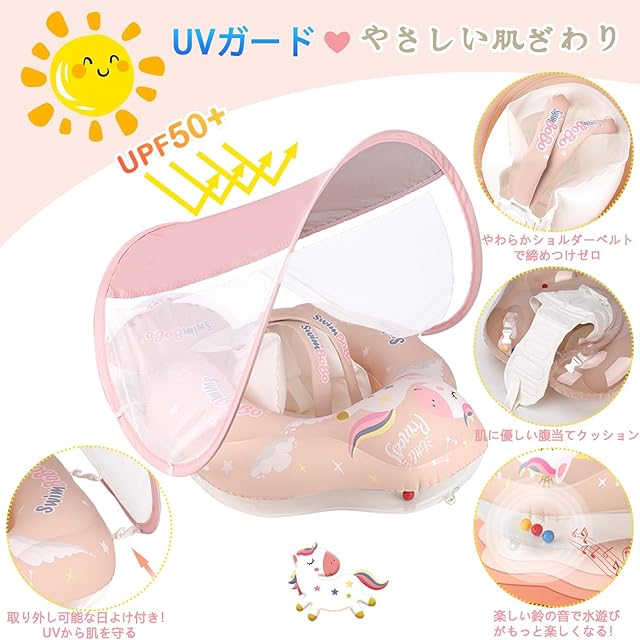 【全方位安定設計】調整可能肩ベルト+ 高めフロントパッド+広幅横ガード+股ずれ防止ポケット+尾部フロートの5重システムで、活発な赤ちゃんの動きも安心サポート。取り外し可能なUV50+日よけ付きで、紫外線から肌を保護。赤ちゃんのプールデビューに最適な設計です。
