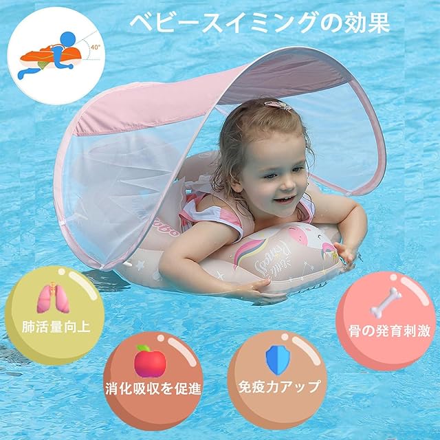 ベビー浮き輪 ベビーフロート 子供浮き輪 足入れ 取り外し可能なサンシェード シートベルト付き UVカット SPF50+ 日焼け止め 浮き輪 赤ちゃん 外遊び 旅行 夏休み お風呂 アウトドア 3ヶ月-6歳の子供用