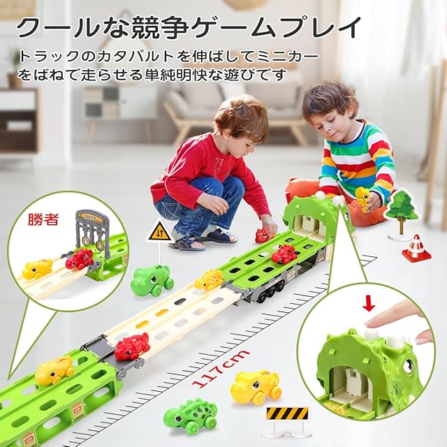 【2人用レース競技】開けた途端に、恐竜の名前を叫びながらバトルさせたり、付属の飛び出すシステムで遊んだりと。。。遊び方は無限の様です!恐竜のおもちゃのトラックは、2人用レーストラックのおもちゃに切り替えられます。レーシングカーのトラックを拡張モードに広げ、恐竜のスロットカーを内蔵のランチャーに押し込み、スタートボタンを押して2人用レースの楽しさを楽しみましょう。マルチプレイヤーの子供用おもちゃは、ご家族にさらなる楽しみをもたらします。