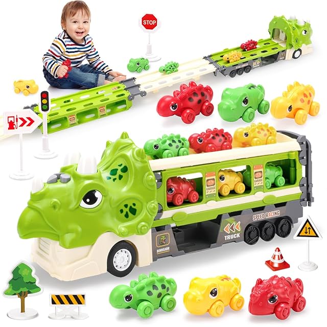 【多機能恐竜トラックキャリア】恐竜型ミニカーがたくさん入っていて思う存分車遊びができるおもちゃです 車好きの男の子に最適ですね。また、開け閉め出来る窓がついた恐竜のトラックに小さな恐竜達が収納されていて、自分でアレコレ動かして遊べる作りも小さな子どもたちには面白いみたいです。目が光り音が鳴るところや、トラックにもなるし、レースもできると言う子供さんの想像力を広げてくれるおもちゃだと思います。2本のAAA電池が必要です(別売り)。