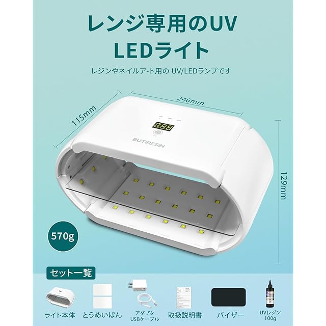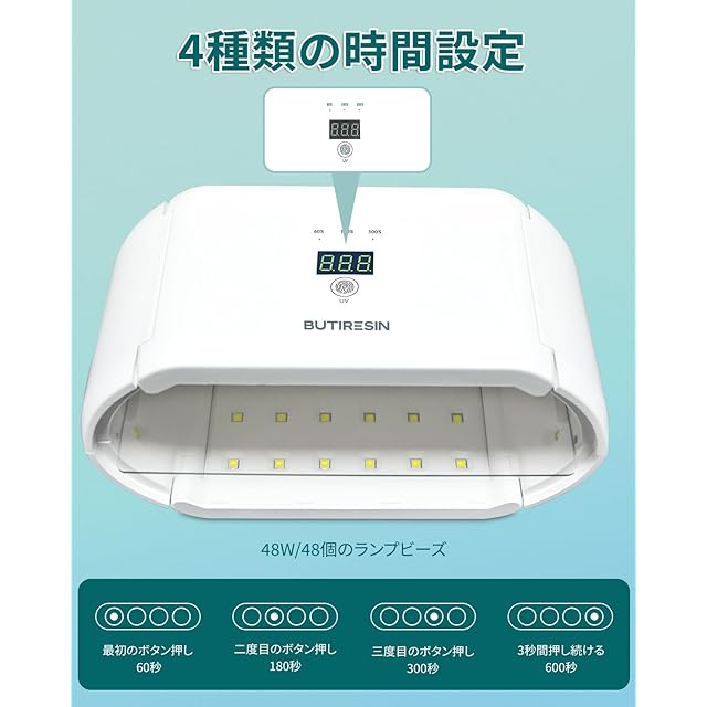 商品名:BUTIRESIN UVライト アドバンス 2 in 1 両面長時間設定 (60s、180s、300s) 48 個の LED 48W 付き レジン ライト 360 度サラウンド光源 ライト uvレジンキット(アップグレード: アダプター+UVレジン 100g付属)