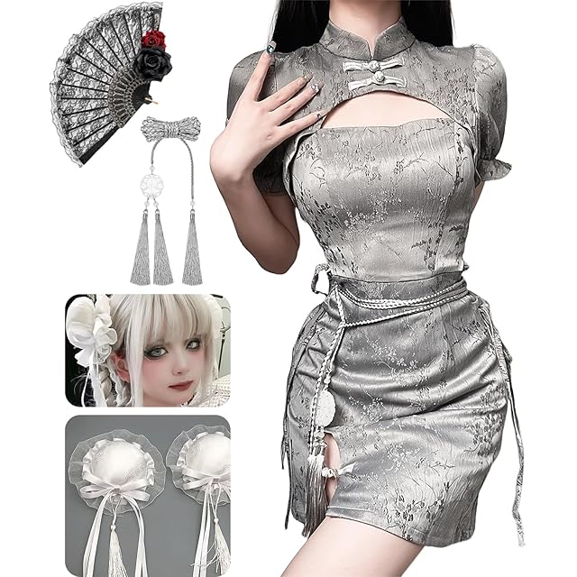 [JIURUN] チャイナドレス コスプレ お団子カバー メイド服 ハロウィン コスプレ ワンピース 服 ゴスロリ衣装 ロリータ コスチュームドレス チャイナ服 可愛い 仮装 チャイナ風 (グレー, XL)