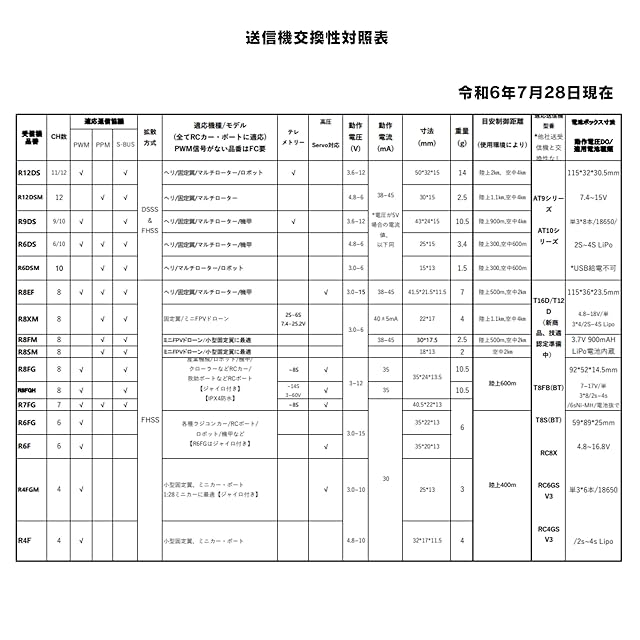 模型用(ドローンを含む)送信機に対応している当社受信機Rシリーズです(フライトコントローラーも含む)。R8FG R7FG R6FG R6F R4F R4FGMから順次公開の予定ですが、型番が多いため、寸法・対応機種・制御距離・テレメトリー機能がつくかどうかなどについてはご購入の前に必ずご確認ください。ご不明の点がございましたら弊社日本駐在員までお気軽にお問い合わせください。*他社送信機には適用しませんのでご留意ください。